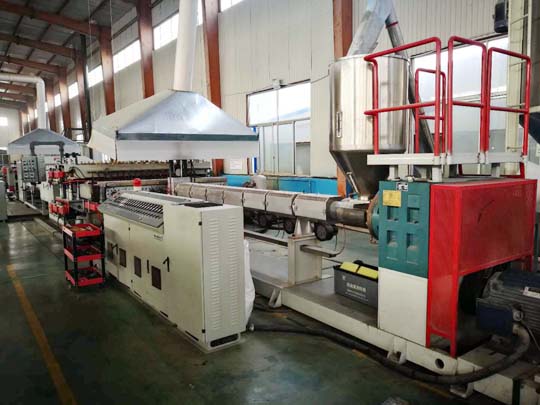 PP格子板設備的組成構造: 塑料建筑模板生產線主要由擠出機、模具、定徑套及冷卻裝置分流支架、模體、芯棒、成型口模組成。
