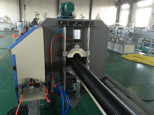 我公司在原有雙壁波紋管設備的基礎上,對于小口徑的雙壁波紋管設備進行了優化和設計。使設備價格比原來的雙壁波紋管設備降低了很多。雙壁波紋管內層和外層采用兩臺針對聚烯氫原料的高效單螺旋擠出機,特殊螺旋結構的共擠機頭,使內層和外層壁厚均勻,成型穩定,生產速度快。成型模塊采用特殊的真空成型方式,夾板串水冷卻,自動打油潤滑等特點。